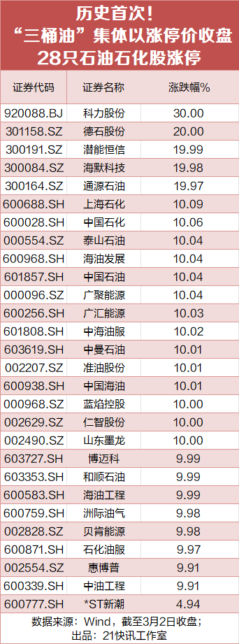 3月2日,A股市场石油石化板块掀起“涨停潮”,48只概念股中有28只涨停,其中“三桶油”中国石油、中国石化、中国海油的股价历史首次集体以涨停价收盘。此外,科力股份30cm涨停,潜能恒信、通源石油、中海油服等多只概念股均涨停。