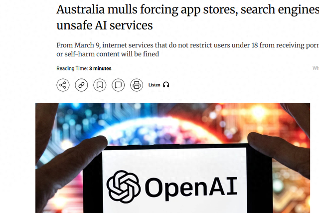 媒体指出,澳大利亚去年12月禁止青少年用社交媒体,如今又对AI出手,从3月9日起,要求相关服务阻止18岁以下人群接触不良内容,违者将面临高额罚款。