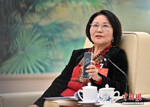 3月8日,十四届全国人大四次会议台湾代表团在北京人民大会堂举行开放团组会议。图为全国人大代表、全国台联副会长陈云英现场拿出手机,向台湾同胞推荐大陆AI助手。 中新社记者 赵文宇 摄