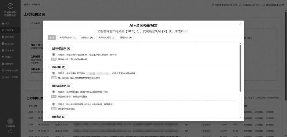 传统合同审核高度依赖法务人员个人经验,存在耗时耗力、标准不一、风险易遗漏等痛点。河南移动直面挑战,依托AI大模型技术,创新打造“豫小合”AI智能体,构建起覆盖全业务场景、可持续迭代的风险识别知识库,内置超200项审核要点与十余类合同范本。首创百分制智能评分模型,遵循“立标准、智能审、出报告”流程,将复杂条款转化为直观量化的风险评价,实现合同审核从定性判断到精准量化的升级。仅需5分钟即可完成初审,自动生成涵盖主体资信、条款合规性、风险提示等维度的《合同智能预审报告》,并附具体修改建议,显著提升审核效率与决策科学性。