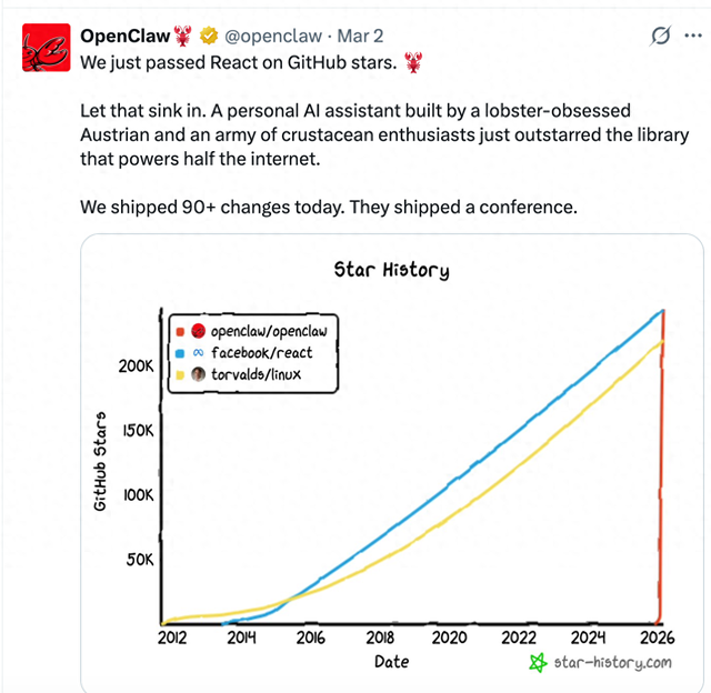 这场风暴的中心,是一款名为OpenClaw的新一代AI Agent(人工智能体)。它的火爆始于今年年初,截至3月2日,OpenClaw在GitHub星标数跃居第一,仅用2个月,就超过了React花费十多年才达成的成就。英伟达首席执行官黄仁勋评价OpenClaw可能是“历史上最重要的软件发布之一”。国内十余家互联网公司下场部署,地方政府也出台支持政策,推动相关产业加速布局。