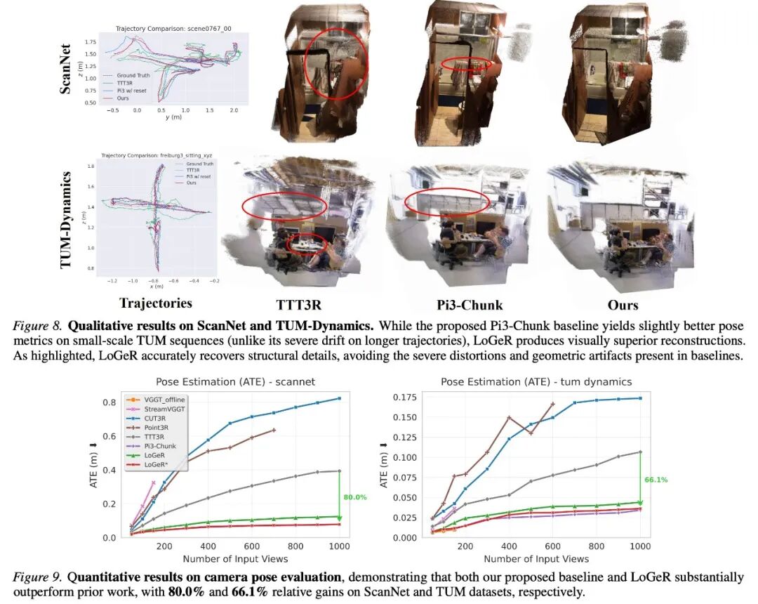 整体来看,无论是在 3D 重建质量还是位姿估计精度方面,LoGeR 及其提出的基线方法均显著优于现有方法。