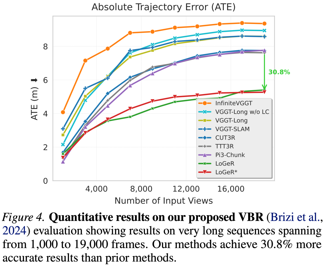 在标准基准测试和重新设计的 VBR 数据集(包含最多 19000 帧的序列)上进行评估时,LoGeR 明显超越了先前的前馈方法,在 KITTI 数据集上将绝对轨迹误差(ATE)降低了超过 74%,并且在前所未有的时间跨度上实现了稳健、全球一致的重建。