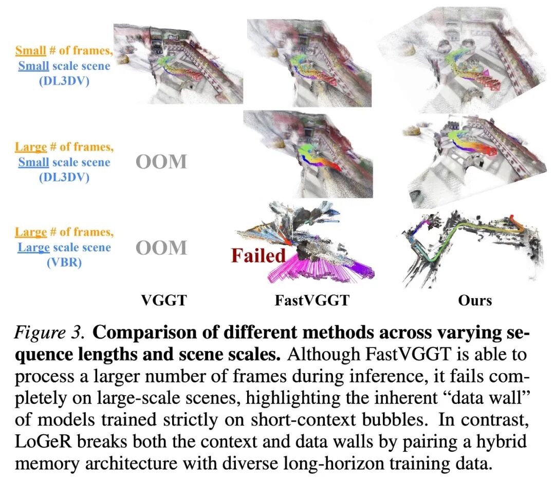 主要障碍源自两个方面,即当前架构中固有的上下文壁垒和训练过程中严重的数据壁垒。从架构角度看,虽然双向注意力对于学习复杂的几何先验至关重要,但其二次复杂度使得它只能应用于短时上下文窗口。而从数据角度看,当前的模型主要在短时上下文「气泡」(几十到一百多帧)上进行训练,这使得它们在推理时无法有效整合长距离依赖(数千到数万帧)。因此,像 FastVGGT 这样的推理时启发式方法,虽然成功缓解了内存瓶颈,但仍无法在大规模 VBR 数据集上进行泛化。