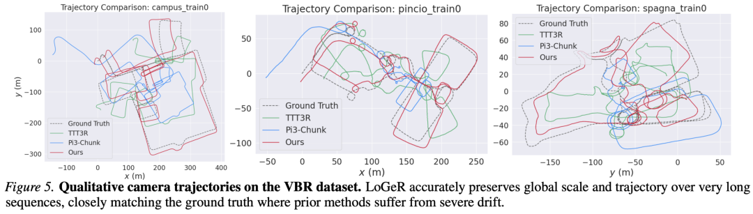 在 VBR 基准上,LoGeR 同样表现出稳定的性能提升。定量结果如图 4 所示,定性结果如图 5 所示。与基线方法相比,LoGeR 中的 TTT 模块能够天然锚定全局尺度,从而保持全局一致性。