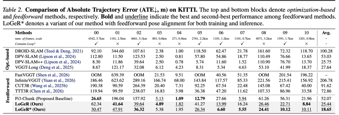 首先,从定量结果来看,LoGeR 以及本文提出的基线方法 Pi3-Chunk,在 KITTI 基准测试上均显著优于现有的前馈式方法(见表 2)。