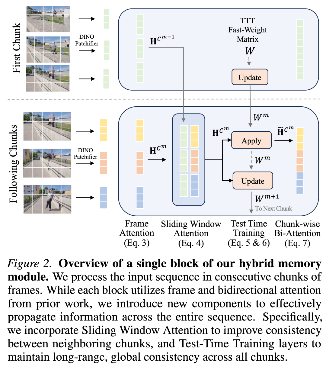 因而需要这样一种前馈架构,它能够同时提供: (i) 强大的局部双向推理能力,以保持密集的几何保真度;(ii) 无损的短程信息传递通道,以保持跨相邻块边界的高精度几何对齐;(iii) 一个线性时间、固定大小的记忆机制,用于在数千帧的长距离内传播全局信息。