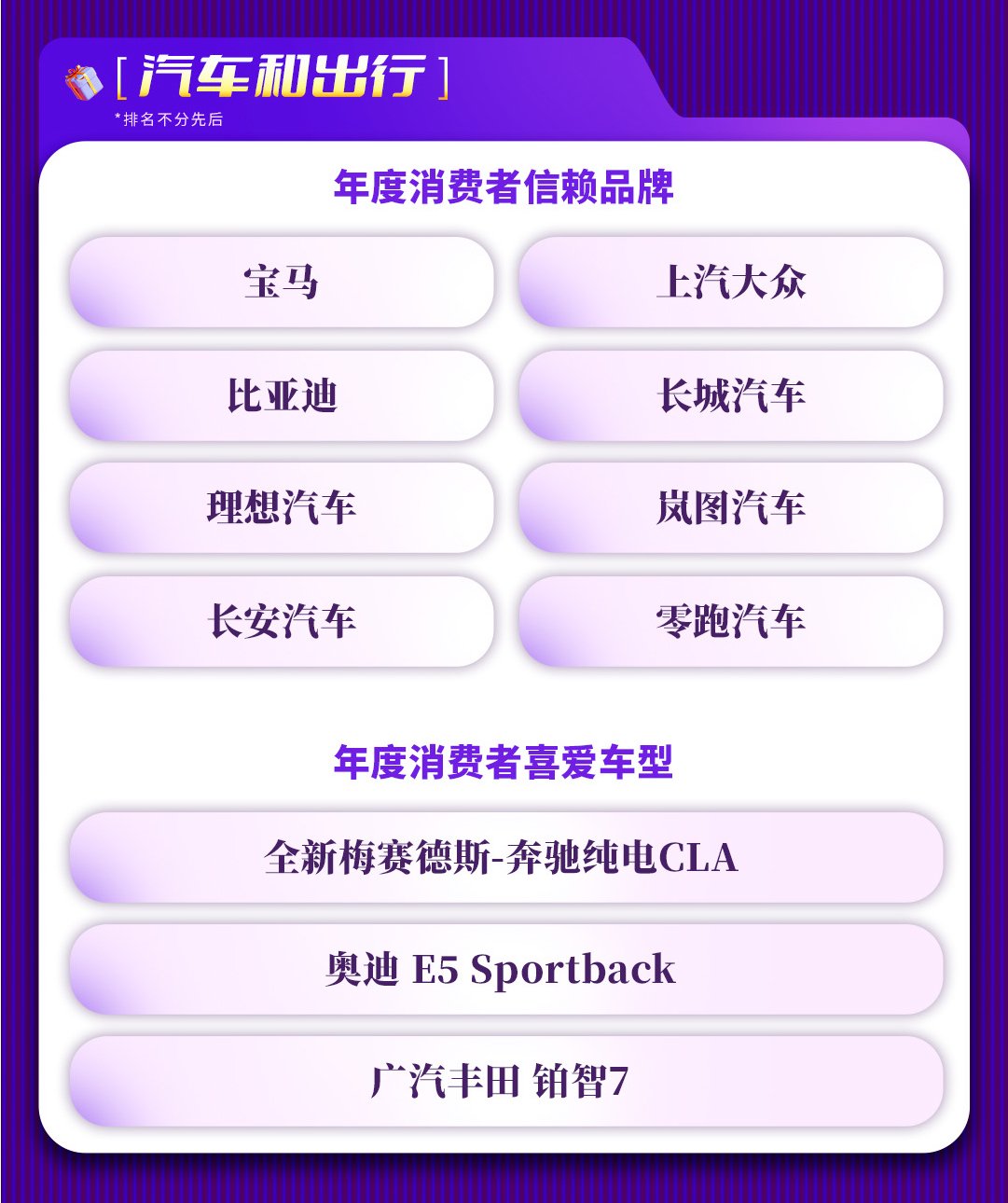 在车型领域,全新梅赛德斯-奔驰纯电CLA、奥迪 E5 Sportback及广汽丰田铂智7共同构成了“年度消费者喜爱车型”的优秀案例矩阵。尤为值得一提的是全新梅赛德斯-奔驰纯电CLA,其搭载的行业领先智驾系统实现了高速、城区及泊车的全场景覆盖;更以超过180次实车碰撞测试的严苛标准,以及“人机共驾”的丝滑交互体验,诠释了豪华品牌在智能时代的匠心。
