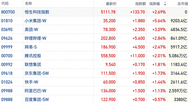 盘面上,今日大型科网股领衔上攻,小米大涨5.6%表现抢眼,美团涨超3%,京东、腾讯、阿里巴巴均涨超1%以上。