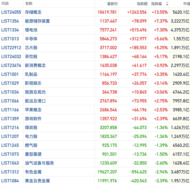 其他方向上,半导体板块、存储芯片、AI应用概念强势上攻,汽车、锂电、海运、生物医药、餐饮股也表现活跃。