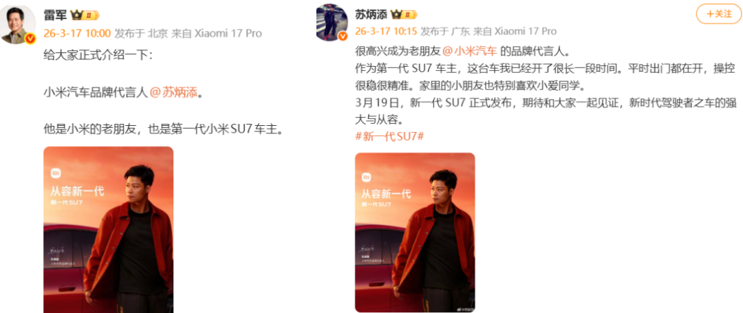 苏炳添曾于2021年8月代言小米品牌,当时正值东京奥运会期间,他以9.83秒刷新亚洲百米纪录。2025年12月苏炳添退役。雷军曾赠送他钻石黑SU7 Max。