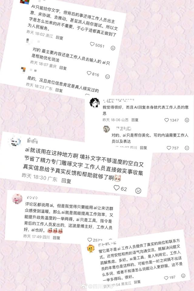 尽管有网友指出,部分表述带有AI生成的痕迹,但网友认为,AI只能提供措辞,背后的事还得工作人员出主意、来协调、去推动,于心于迹都真正做到了为人民服务。网友认为这是人工智能真正合理的用法。