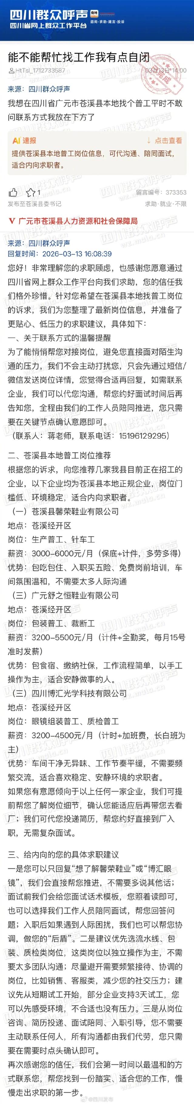 当天,苍溪县人力资源和社会保障局回复:“非常理解您的求职顾虑,也感谢您愿意通过四川省网上群众工作平台向我们求助,您的信任我们格外珍惜。针对您希望在苍溪县本地找普工岗位的诉求,我们为您整理了最新岗位信息,并准备了更贴心、低压力的求职建议。”