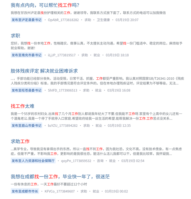 这条帖子火了以后,四川群众呼声平台后续又有四川各地网友发布求职帖,各地相关部门也一一回复。