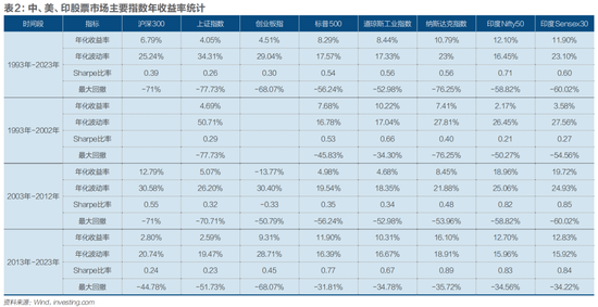表1是中、美、印三国股市主要股指年收益率统计。从1993年初至2023年12月15日,上证指数上涨了2.3倍,而标普500、道琼斯工业指数上涨了10倍左右,纳斯达克指数上涨了20.9倍,Sensex30指数更是上涨了28.5倍。从年收益率的平均值上来看,A股指数并不比其他几个指数差。沪深300收益率平均值是最高的17.54%,上证指数、创业板指虽然比不上纳斯达克、Nifty50和Sensex30指数,但高于标普500和道指。