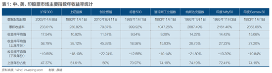 在上涨的年份里,A股三个指数的收益率平均值都高于其他几个指数。在下跌的年份里,A股指数的平均跌幅在20%左右,和纳斯达克、Nifty50、Sensex30指数相当。A股指数的累计涨幅不如其他五个指数的原因在于上涨的年份少,上涨和下跌的年份相当,各占一半左右,而美国、印度股市指数在大概四分之三的年份是上涨的。