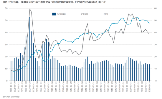 截至2023年三季度,沪深300指数的累积收益率是292%,而当前EPS相比2005年初EPS增长了378%,指数的增长落后于EPS的增长,这表明沪深300指数表现不佳是因为估值的下降,这在图1中可以很清楚地看出来。差不多从2011年底开始,在大部分时间内沪深300指数的表现不如它的EPS。