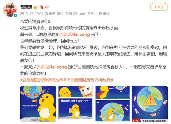 正当该消息在网上猛烈发酵时,13日晚间,香飘飘再次通过官方微博发文称,经过紧急排查,香飘飘暂停绕地球的真相终于浮出水面,原来是……治愈星萌龙@奶龙Nailoong 来了!香飘飘要暂停绕地球,回到地上!香飘飘称奶龙将担任“香飘飘绕地球治愈合伙人”。