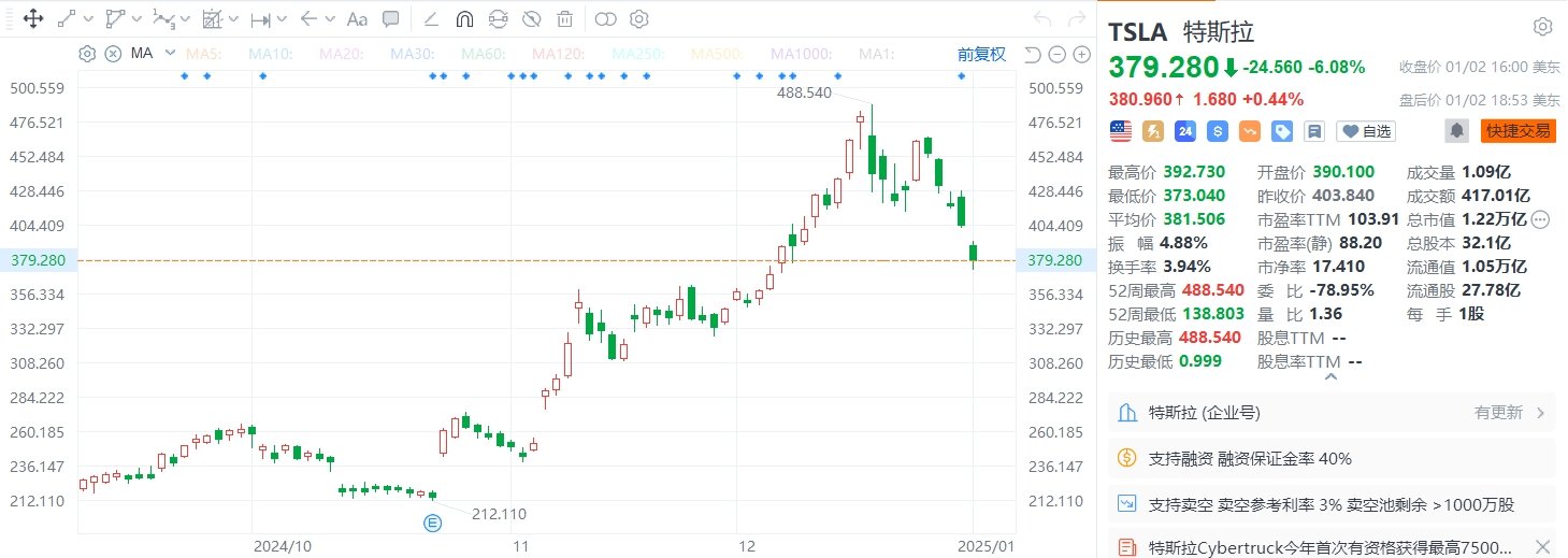 格隆汇1月3日|特斯拉(TSLA.US)跌6.08%,为连续第5日下跌,报379.28美元,总市值1.22万亿美元。特斯拉第四季度总交付量为495570辆,市场预估为512277辆;第四季度汽车产量为459445辆,市场预估为505239辆。特斯拉年度汽车交付量也出现了十多年来的首次下降,尽管该公司2024年第四季度的交付量创下了历史新高。特斯拉2024年汽车交付量为179万辆,低于2023年的180万辆,也低于分析师普遍预期的180万辆。(格隆汇)