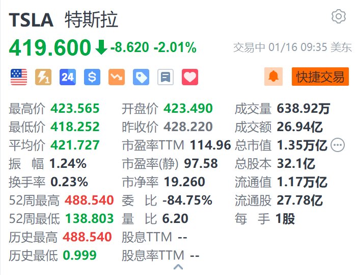 格隆汇1月16日|特斯拉(TSLA.US)跌超2%,报419.6美元。消息面上,巴克莱警告称,特斯拉的叙事越来越偏离其基本面。具体来看,特斯拉目前的估值为2025年市盈率的123倍,表明“马斯克溢价”现已达到历史新高。巴克莱认为,基本面最终将重新成为特斯拉投资者关注的重点。