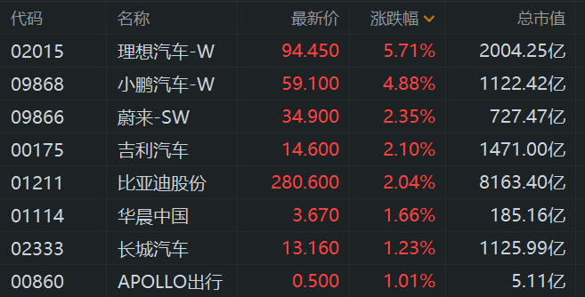 汽车股集体拉升上涨,其中,理想汽车涨近6%,小鹏汽车涨近5%,蔚来汽车、吉利汽车、比亚迪涨超2%,华晨中国、长城汽车跟涨。