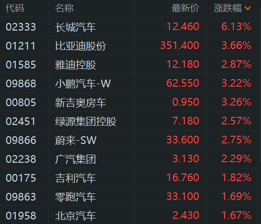 港股汽车股集体拉升上涨,其中,长城汽车涨超6%,比亚迪股份涨3.66%,小鹏汽车涨超3%,蔚来汽车、吉利汽车、广汽集团、零跑汽车跟涨。