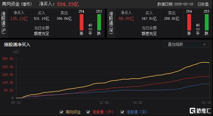 今日,南向资金净买入224.23亿港元,其中港股通(沪)净买入135.13亿港元,港股通(深)净买入89.09亿港元。