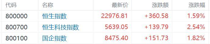 港股三大指数持续上涨,早盘冲高午后小幅回落后再度拉升,目前三大指数均步入技术性牛市。截止收盘,恒指、国指分别上涨1.59%及1.82%,恒指一度站上23000点上方,恒生科技指数涨2.54%表现最强,三者继续刷新阶段新高。