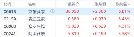 互联网医疗股走强,京东健康涨超6%,麦迪卫康涨超5%,众安在线、阿里健康跟涨。