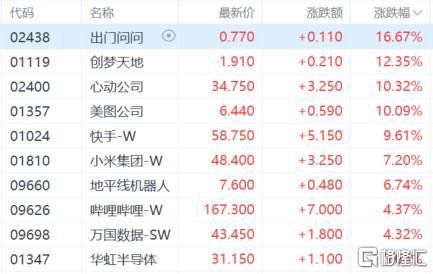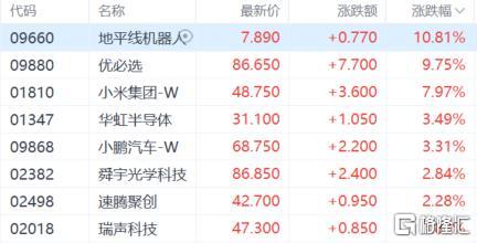 机器人概念走高,地平线机器人涨超10%,优必选涨超9%,小米集团涨超7%,华虹半导体、小鹏汽车等跟涨。