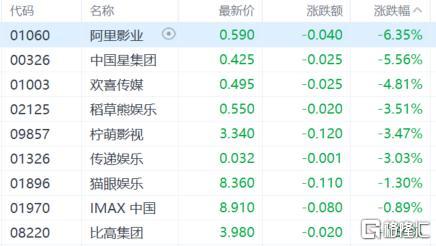 影视股大跌,阿里影业跌超6%,中国星集团跌超5%,欢喜传媒、稻草熊娱乐、柠萌影视等跟跌。