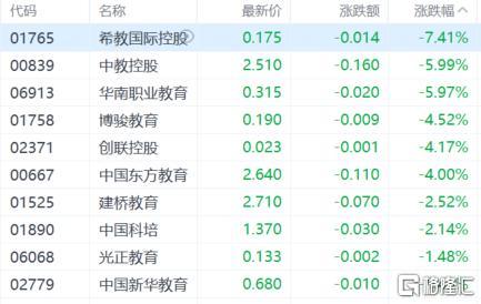 教育股跌幅居前,希教国际控股跌超7%,中教控股、华南职业教育跌超5%,中国东方教育、中国科培等跟跌。