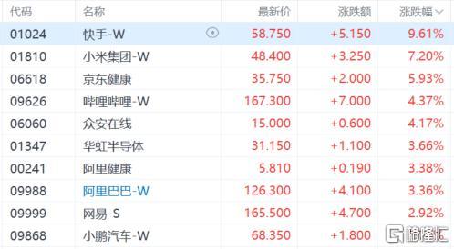 大型科技股大涨,快手涨超9%,小米集团涨超7%,京东健康涨超5%,哔哩哔哩、众安在线等跟涨。