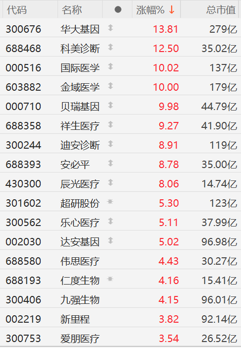 格隆汇2月19日|A股市场AI医疗概念股活跃,其中,华大基因涨超13%创2023年4月以来新高,科美诊断涨超12%,国际医学、金域医学、贝瑞基因10CM涨停,祥生医疗涨超9%,安必平、迪安诊断、辰光医疗涨超8%,超研股份、乐心医疗、达安基因涨超5%,伟思医疗、仁度生物、九强生物涨超4%。