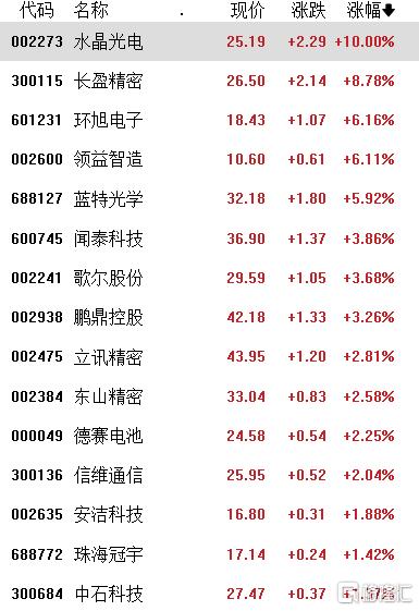 消费电子板块涨幅居前,水晶光电涨停,环旭电子、领益智造涨超6%,蓝特光学涨超5%,闻泰科技(维权)、歌尔股份涨超3%。