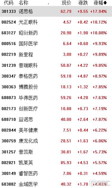 医疗服务板块继续上涨,诺思格涨超17%,光正眼科、昭衍新药、国际医学涨停,普瑞眼科涨超9%,泰格医药涨超8%,博腾股份、毕得医药、创新医疗涨超7%,美年健康涨超6%。