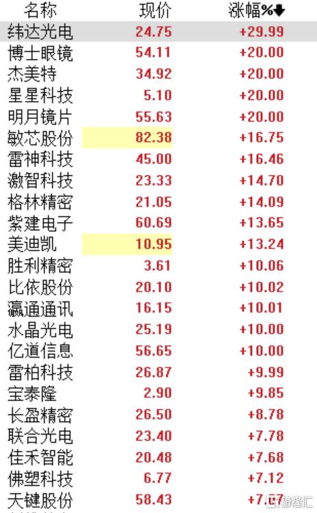 AI眼镜板块全线爆发,纬达光电30CM涨停,博士眼镜、明月镜片20CM涨停,敏芯股份、雷神科技涨超16%,亿道信息、水晶光电、胜利精密、瀛通通讯、比依股份、雷柏科技等涨停。