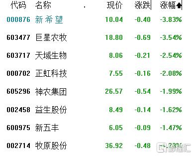 猪肉股跌幅居前,新希望、巨星农牧跌超3%,天域生物、正虹科技(维权)跌超2%,牧原股份跌超1%。