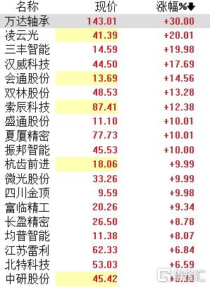 人形机器人板块继续走强,万达轴承30CM涨停,三丰智能20CM涨停,汉威科技涨超17%,夏厦精密、振邦智能等涨停,长盛轴承涨超8%。