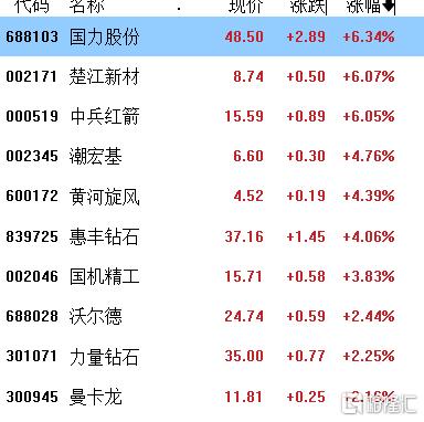 培育钻石板块表现活跃,中兵红箭涨超6%,黄河旋风、汇丰钻石涨超4%,国机精工涨超3%。