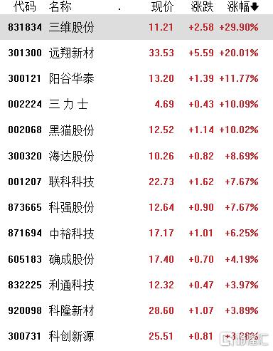 橡胶制品领涨,三维股份30CM涨停,远翔新材20CM涨停,阳谷华泰涨超11%,三力士、黑猫股份涨停,海达股份涨超8%,科强股份、联科科技涨超7%,中裕科技涨超6%。