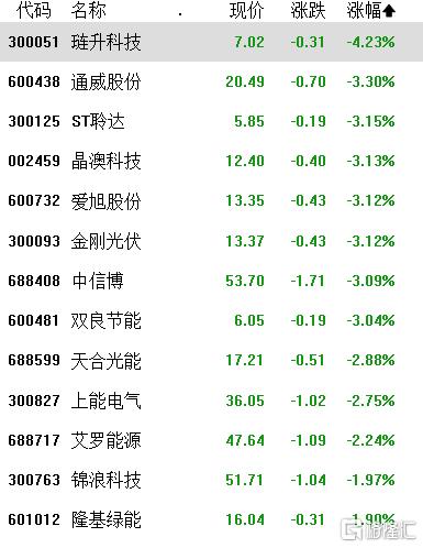光伏股走弱,琏升科技跌超4%,通威股份、晶澳科技、爱旭股份跌超3%,天合光能、上能电器跌超2%,锦浪科技、隆基绿能跌超1%。