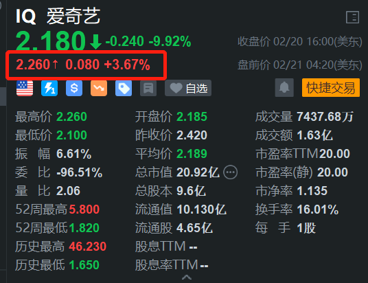 格隆汇2月21日|中概股盘前大幅上涨,其中爱奇艺(IQ.US)盘前涨3.67%。消息上,爱奇艺日前发布2024Q4及全年财报。花旗、美银证券发布业绩快评,均维持爱奇艺“买入”评级,目标价分别为3.1美元和3.5美元。2月20日, CFRA发布的最新评级信息显示,维持爱奇艺持有评级,并将目标价从2.3美元上调至2.5美元。