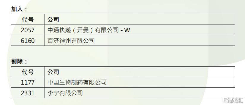 恒生中国企业指数调入中通快递、百济神州,剔除中国生物制药、李宁,成份股数目维持50只。