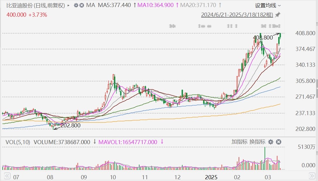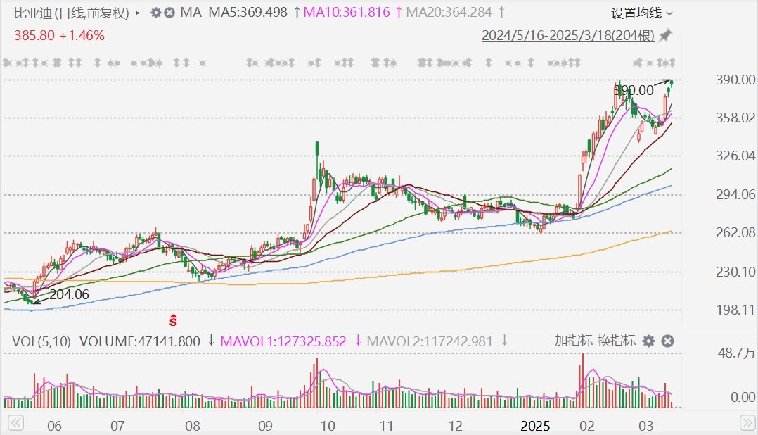格隆汇3月18日|港股比亚迪股份(1211.HK)盘初一度涨6%报408.8港元,再创历史新高;A股比亚迪(002594.SZ)一度涨超2%报390元,亦创历史新高。比亚迪市值七年来首次超过宁德时代。