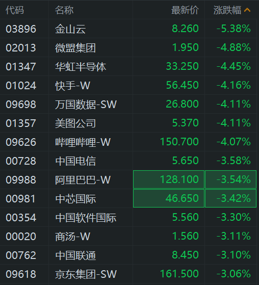 港股DeepSeek概念股普遍弱势,其中,金山云跌超5%,微盟集团跌4.88%,万国数据、美图公司、华虹半导体跌超4%,中国软件国际、商汤均跌超3%。