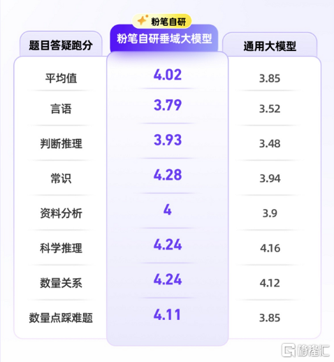 数据验证了粉笔垂域大模型的实力。根据内部测评,在题目答疑场景,粉笔自研垂域大模型在言语、判断推理、常识、资料分析等科目中的跑分表现均优于DeepSeek等通用大模型。