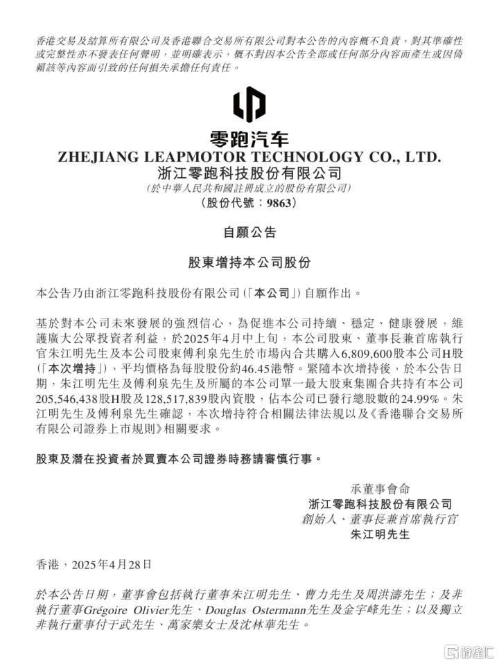 除此之外,公司创始人兼CEO朱江明及一致行动人傅利泉在今年4月也在不断增持公司股份,用真金白银表达对公司前景的坚定信心。根据零跑4月28日晚披露的公告统计,2025年4月中上旬,上述股东合计增持超680万股、金额超3亿港币。值得一提的是,此次增持是在去年3亿港币增持的基础上再一次增持。