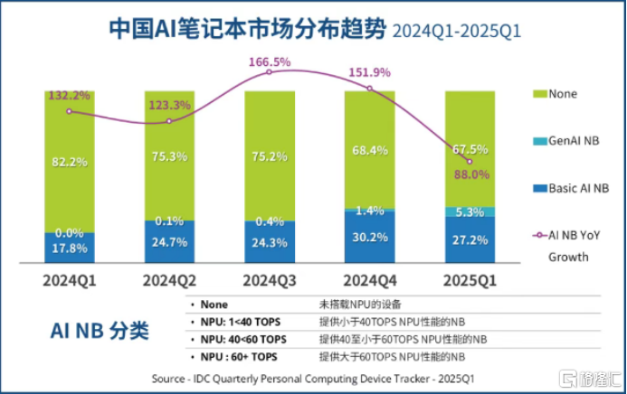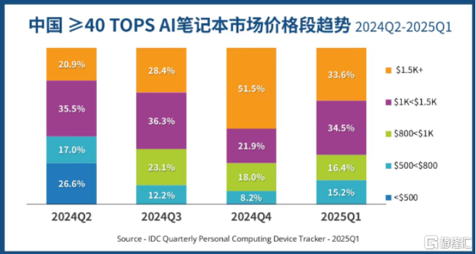 近日,国际数据公司(IDC)发布最新数据,显示 2025 年一季度(25Q1),中国市场搭载 40TOPS 及以上 NPU 算力的笔记本电脑出货量显著增长,达到 24.1 万台,占中国笔记本电脑市场出货量的 5.3%,而上季度这一份额仅为 1.4%。这一趋势表明 AI 笔记本电脑作为新兴的消费电子品类,正在快速打开市场,获得消费者的认可。