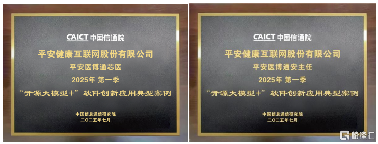 平安健康医疗科技有限公司(以下简称"平安好医生"或"公司")的两项医疗AI产品"平安芯医"、"安主任"获得荣誉授牌。凭借数据+模型+场景的闭环服务能力,及打破速度、质量、成本不可能三角的技术突破,成功入选信通院首批"开源大模型+"软件创新应用典型案例"精选案例",并通过开源大模型集成应用能力质效评估,成为医疗健康领域AI技术赋能的标杆。